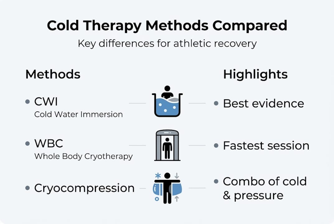 Now that you know how cold therapy supports your body, let’s compare the leading options for athletic recovery. Three methods dominate the research: cold water immersion (CWI), whole-body cryotherapy (WBC), and cryocompression.